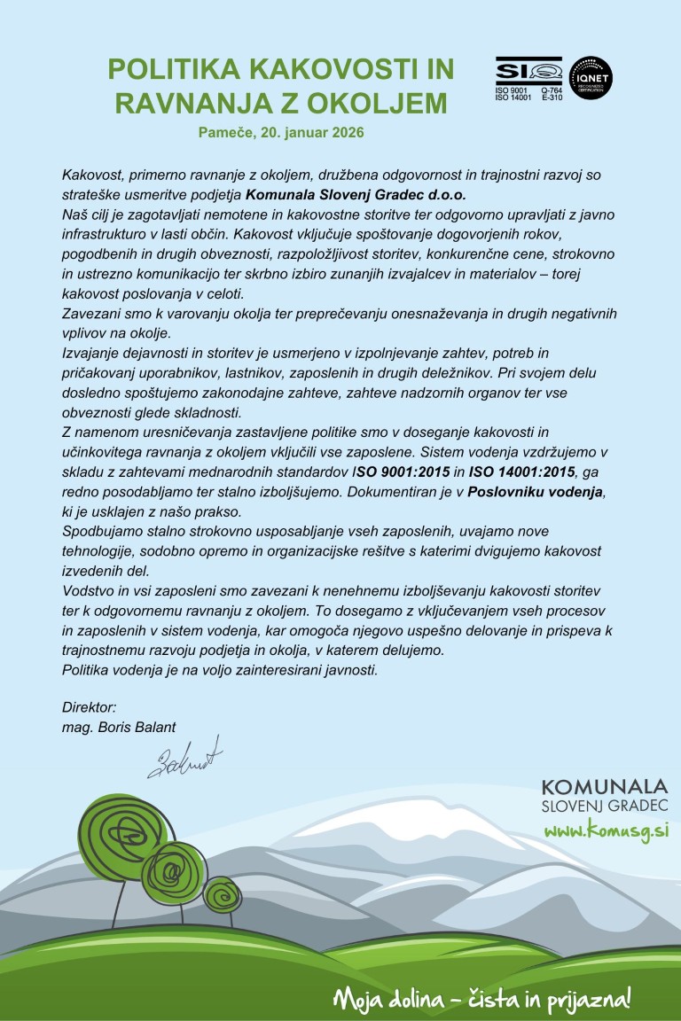 V podjetju se zavedamo, da je kakovostno izvajanje dejavnosti in storitev eden izmed ključnih dejavnikov za dobro poslovanje podjetja. V letu 2005 smo pridobili mednarodni certifikat ISO 9001 za kakovost in v letu 2008 mednarodni certifikat ISO 14001 za odgovorno ravnanje z okoljem. Oba certifikata vsako leto uspešno certificiramo.